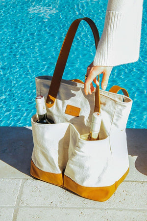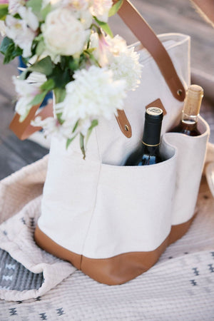 The Ivy Cove Ojai Wine Bottle Carrier Bag is an essential for anyone who enjoys a stroll along the beach, through the fields, or a light hike through the hills as a means to a wine picnic at the end! With room enough for 4 bottles, a blanket, and some knives and cheese, it will prove as useful as it does stylish. With leather handles and bottom, the bag can handle a little rough and tumble while aging beautifully over time. This version has a cooling lining to keep your food and drinks at the best temperature.