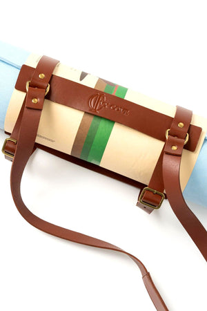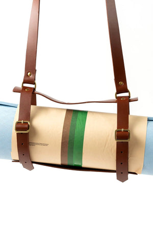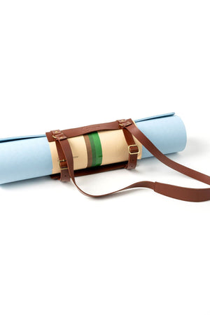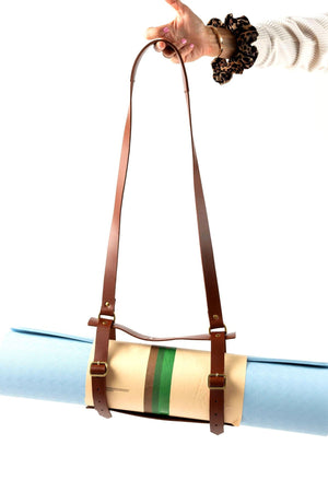 Carry your mat in style with the Dunes Yoga Mat Harness from Ivy Cove. The leather carrier ties around most standard sized mats for easy transport and ultimate style that will take you from workout to brunch or wherever your day is headed. The harness is constructed of premium, responsibly sourced leather with metal buckles and reinforcements.