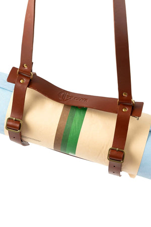 Carry your mat in style with the Dunes Yoga Mat Harness from Ivy Cove. The leather carrier ties around most standard sized mats for easy transport and ultimate style that will take you from workout to brunch or wherever your day is headed. The harness is constructed of premium, responsibly sourced leather with metal buckles and reinforcements.