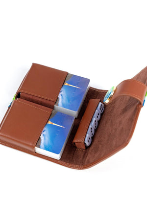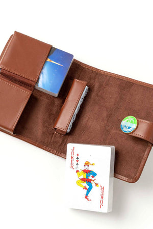 The Aurora Poker Set allows you to stylishly carry your favorite game wherever you go without a second thought. Simply grab and go! The carrying case is styled in Saddle leather and has two built in slots that hold two decks of Ivy Cove signature playing cards and a slot for 5 dice. Finishing the piece off is a leather Blue/Green stripe closure that fastens with a state-of-the-art magnetic closure. Did someone say Royal Flush?!?!?