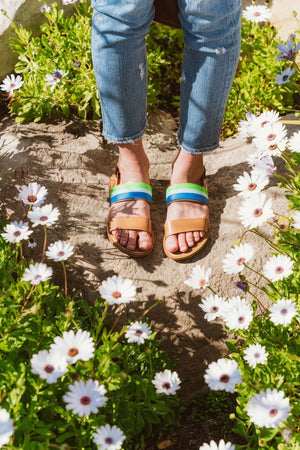 The footbed of these sandals are made from 100% pre-consumer cutting room leather scraps that come with the manufacturing of leather goods. These leftover materials are usually sent to landfills but are now being processed and upcycled into beautiful designs that are comfortable, durable, and sustainable. This practice of conscious consumption using a closed loop production system supports our planet and is one of the most conscious ways of sourcing leather.